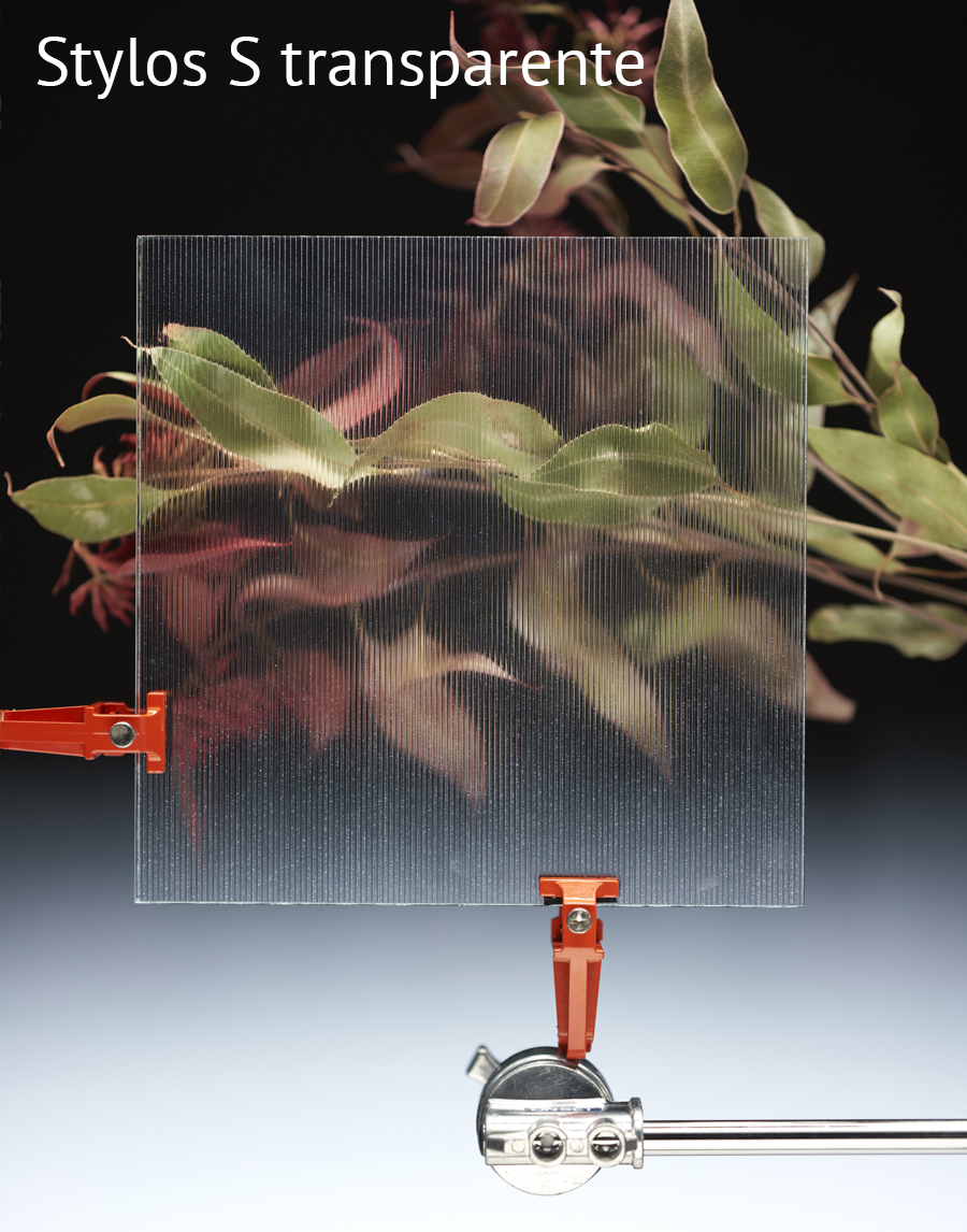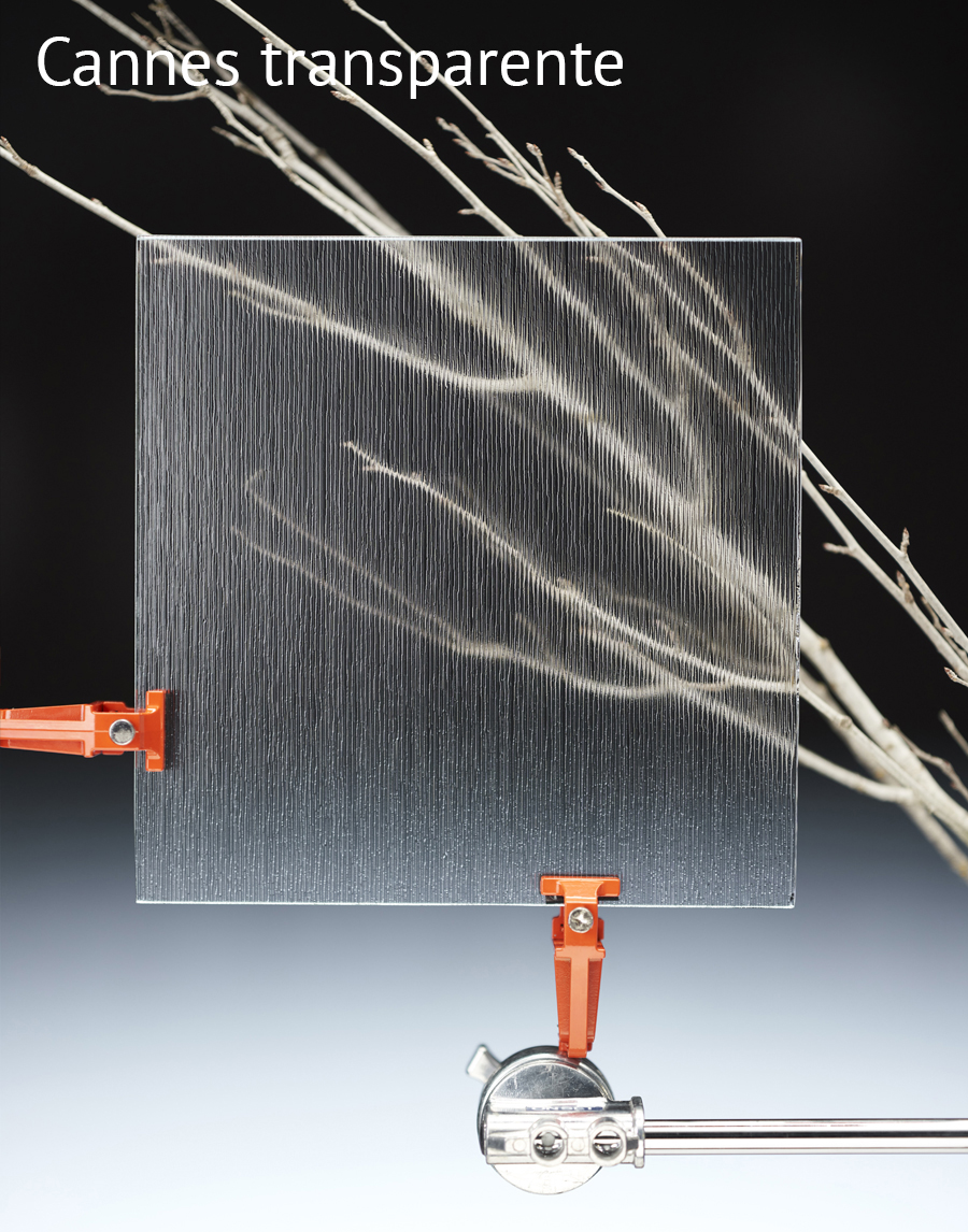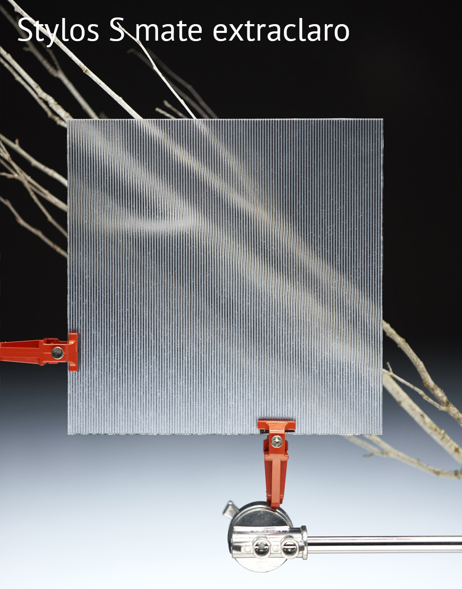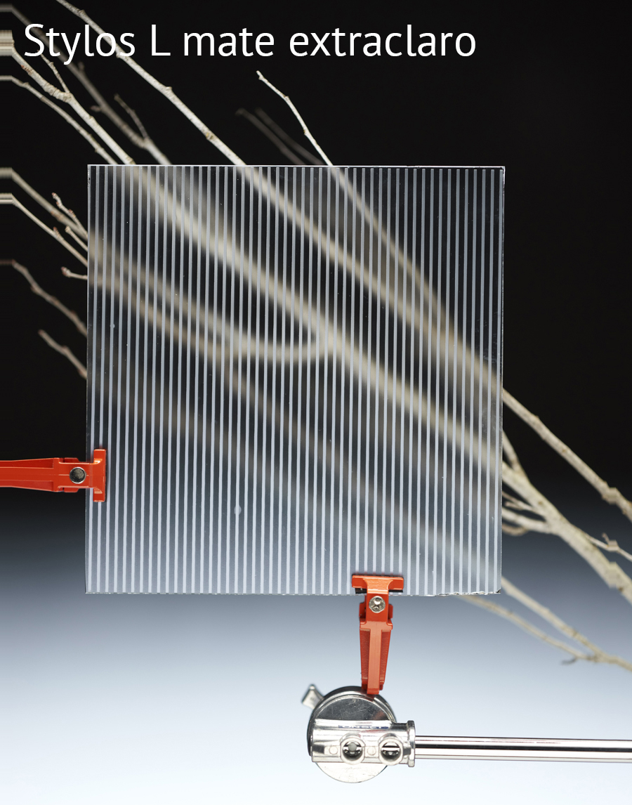 Colección de Vidrios con textura de patrones lineares: Stylos S Transp, Stylos S Mate, Stylos L Transp, Stylos L Mate, Cannes Transp, Cannes Mate, Rim