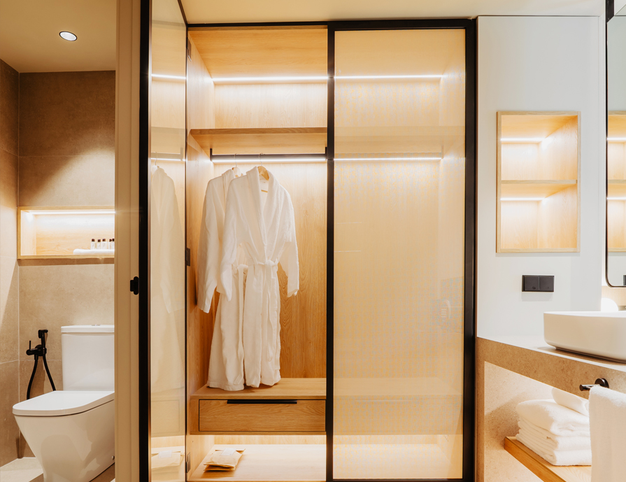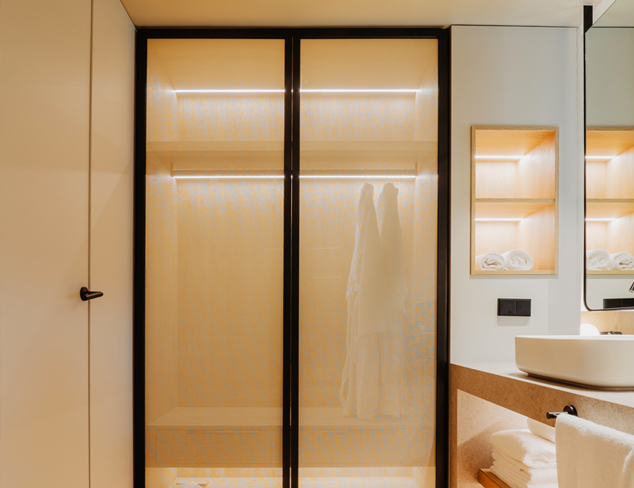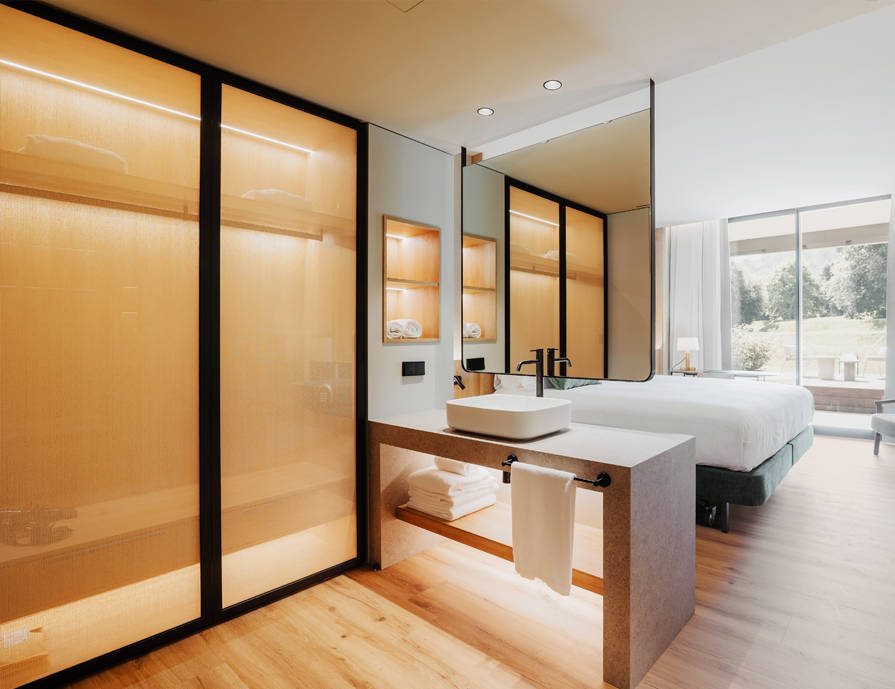 Hemos seleccionado materiales atemporales y duraderos que se adaptan a la línea estética del resto del hotel. El espacio se ha redistribuido abriendo la zona de lavabo e integrándolo en el espacio del dormitorio.